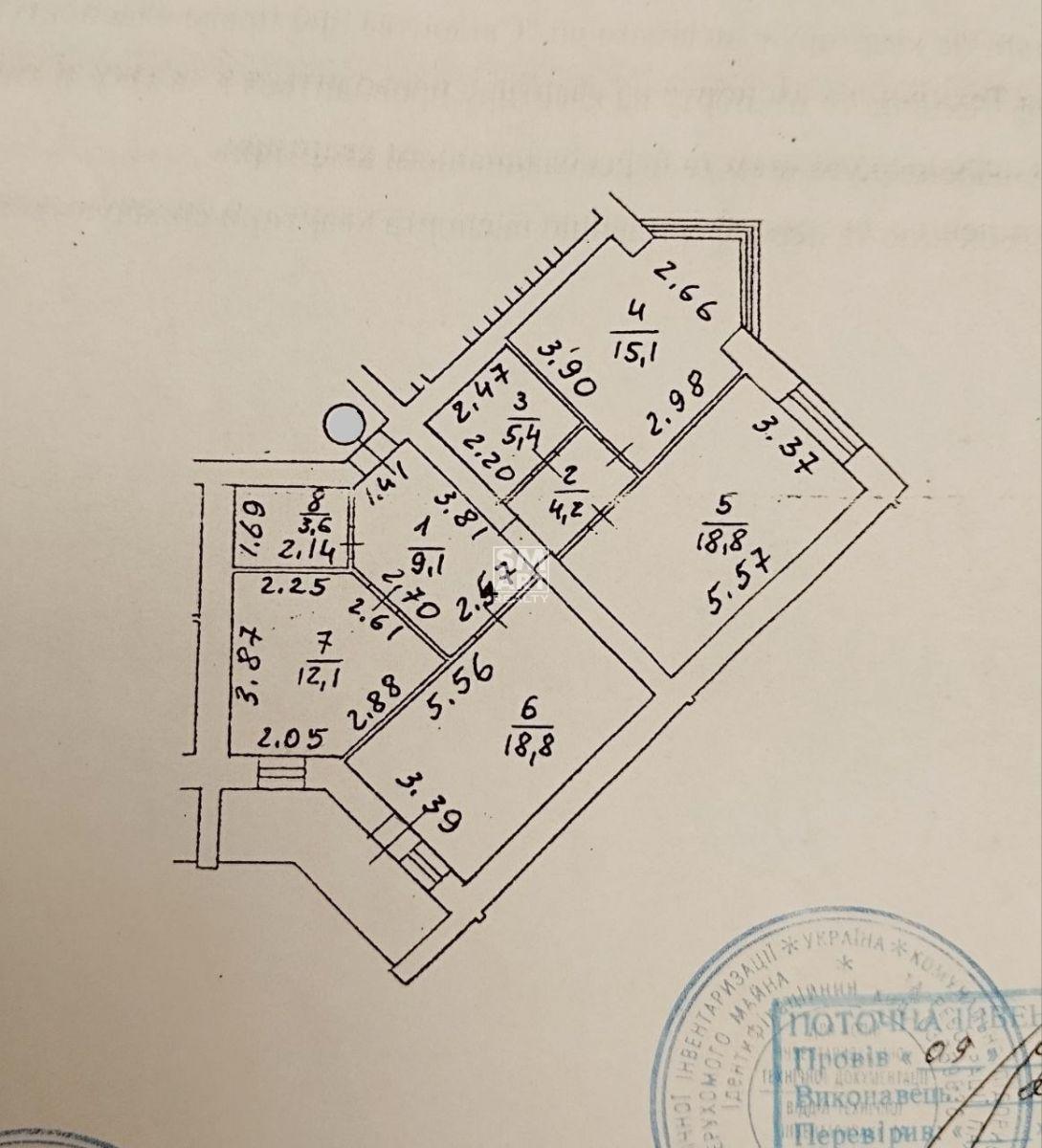 В квартирі зручне планування,два санвузли,три окремі кімнати(15.1 м²; 18.8 м²;18.8 м²) хол,з кухні(12.1 м².) вихід на балкон.